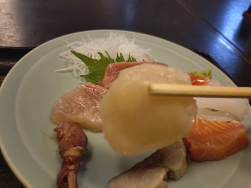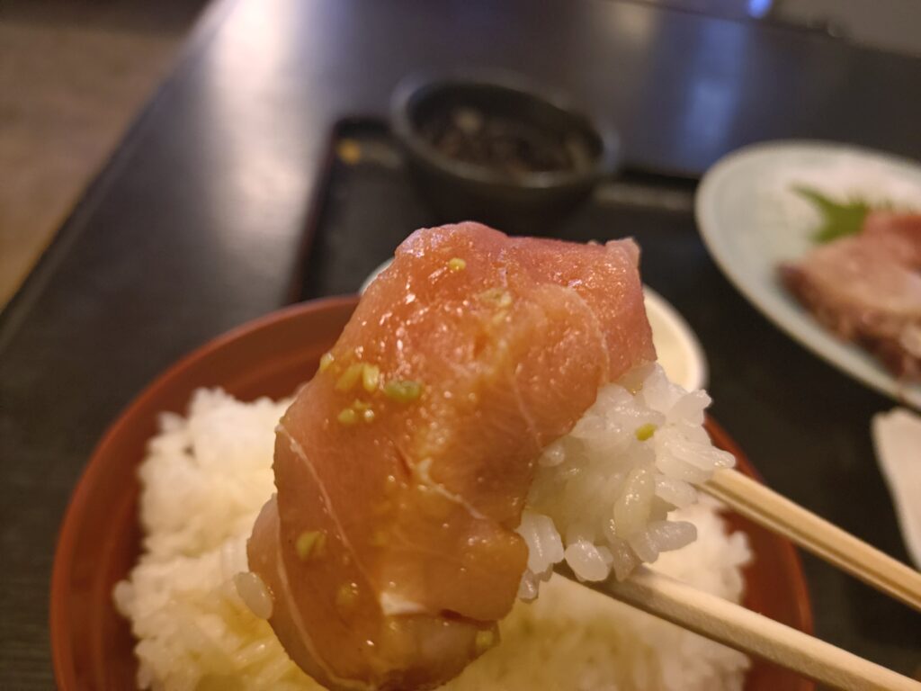 わさび醤油を付け、ご飯に乗せたらもう幸せ気分。