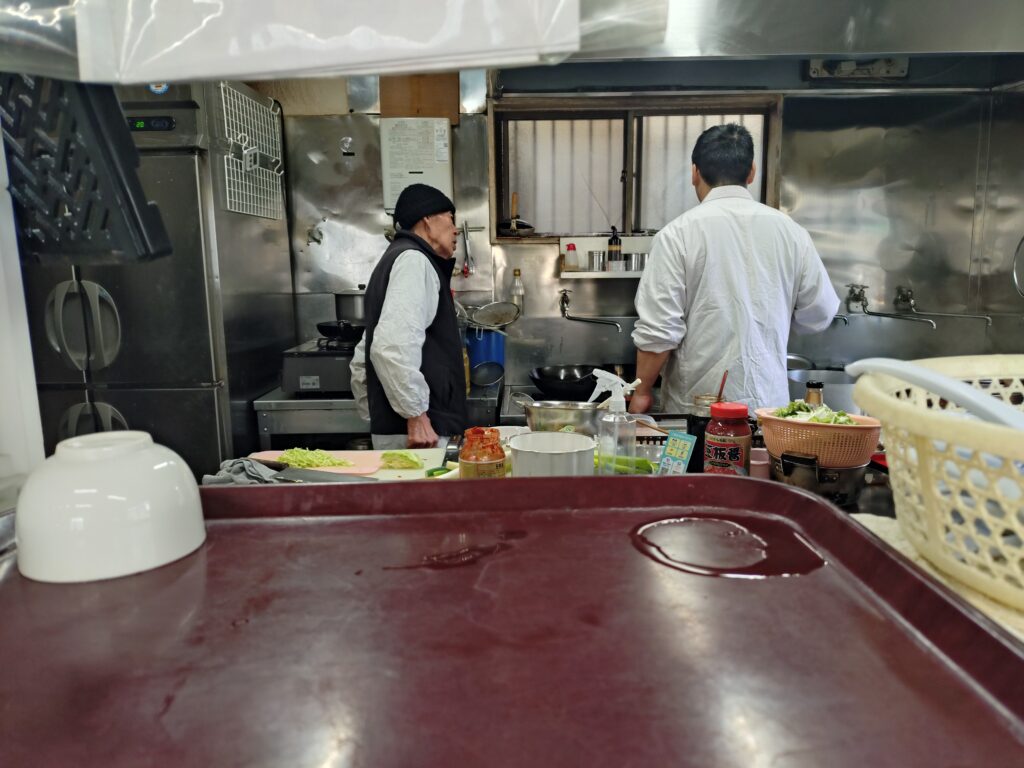 厨房では、息子さんがメインで鍋を振り、その横でおじいちゃんがサポート。