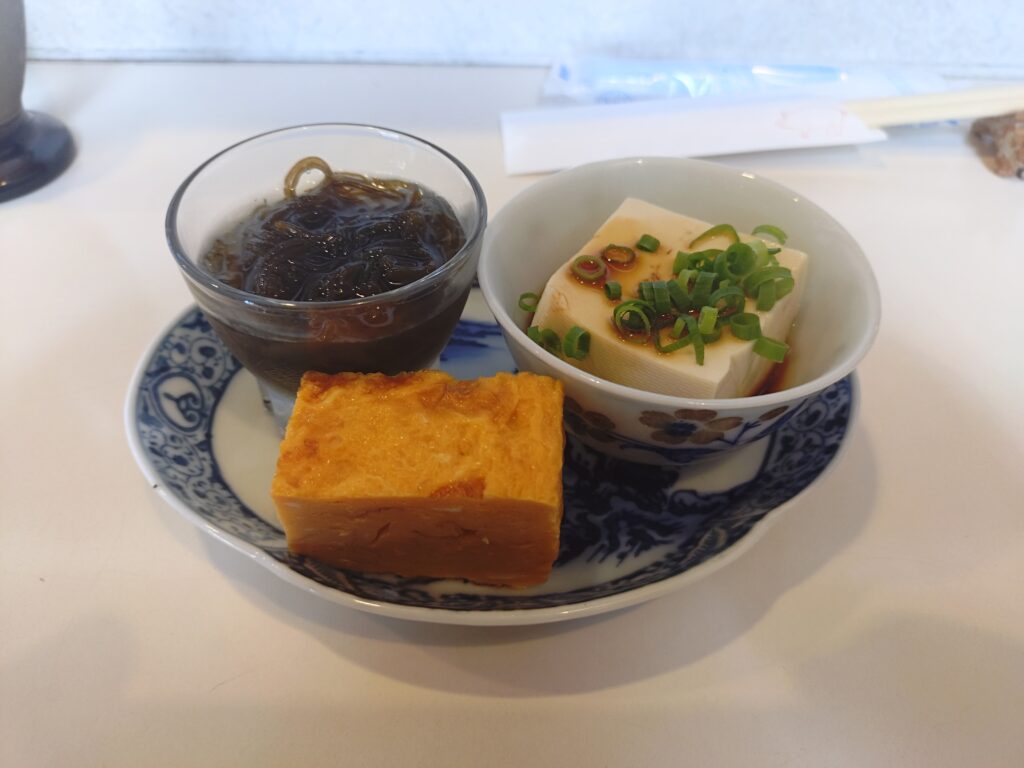 もずく、湯豆腐、卵焼きの3品がついていて、これだけでもしっかり満足感があります。