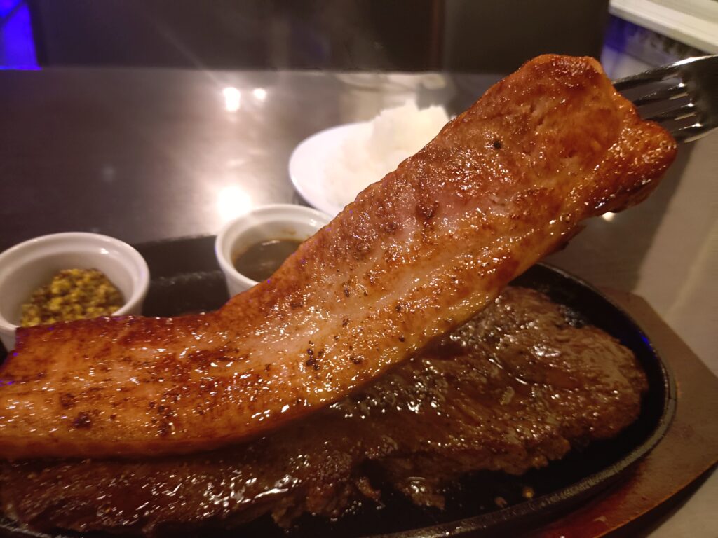いつもはステーキだけですが、たまには自分にご褒美という事で、ベーコンをトッピング。